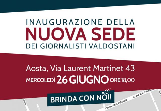Il trasloco è finito, la nuova sede è quasi pronta. Siamo lieti di annunciare che, mercoledì 26 giugno alle 18, si terrà l’inaugurazione della nuova casa dei giornalisti valdostani. Gli spazi di via Laurent Martinet 43, ad Aosta, nel cortile del Palazzo Stella, ospitano l’Associazione Stampa Valdostana, l’Ordine dei giornalisti della Valle d’Aosta, la consulta regionale della Casagit e l’ufficio di corrispondenza dell’Inpgi.